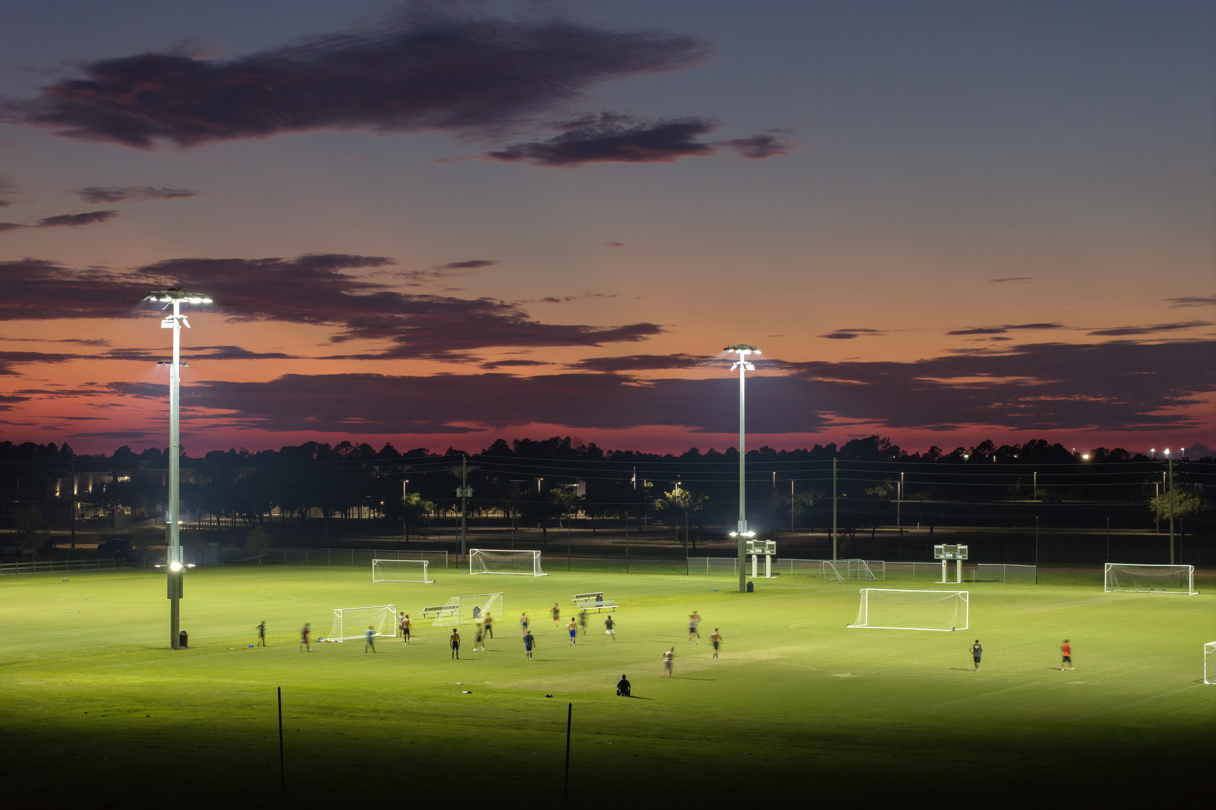 The field surroundings are illuminated with LED floodlights in a way that is suitable for night matches. Spectator stands, digital scoreboards, player dugouts, substitute benches and perimeter safety barriers are integrated with the field. The entire structure is designed to be comfortable and safe for both players and spectators.